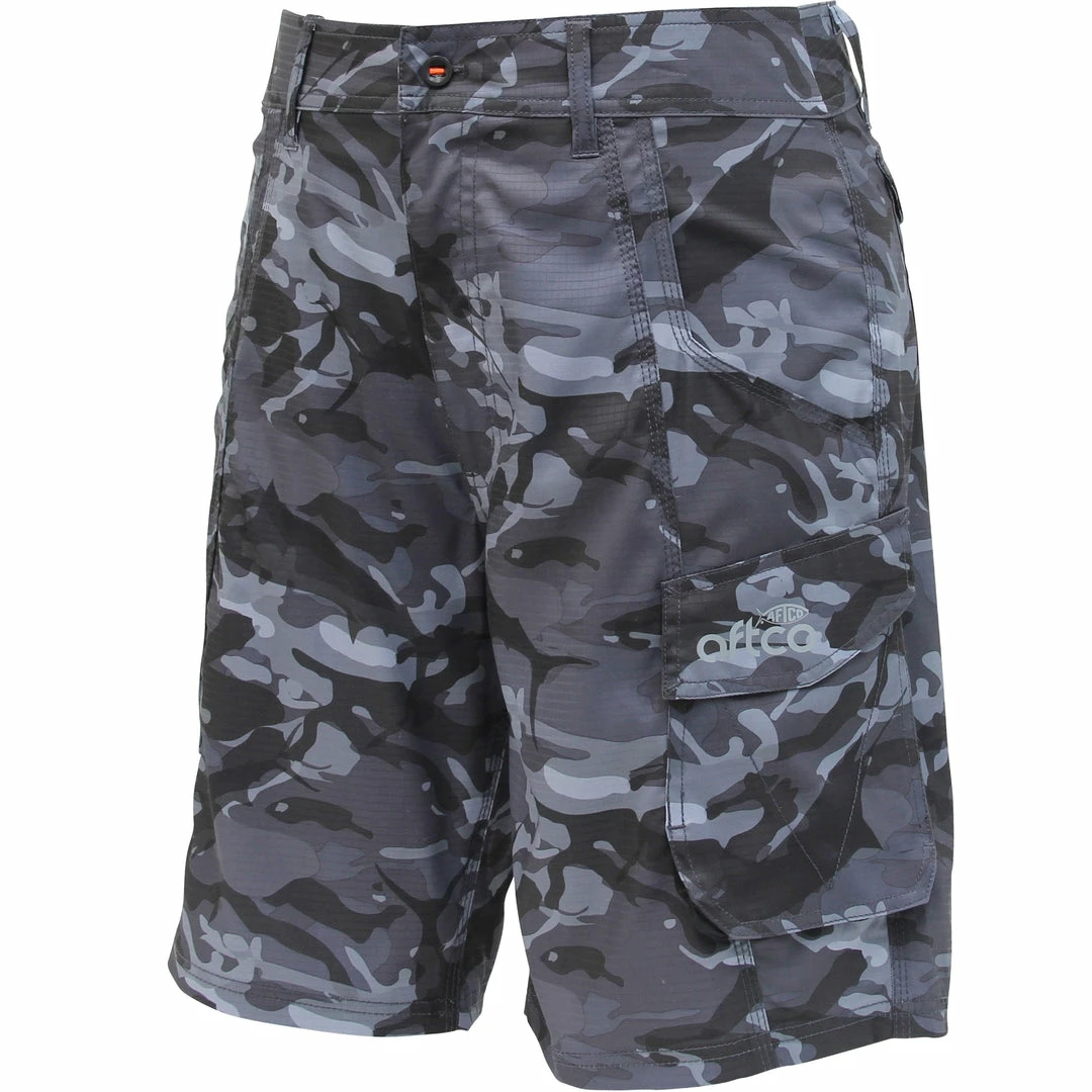 Meet the next generation of AFTCO shorts, featuring lightweight ripstop camo.  The Camouflage Tactical fishing short features an exclusive AFTCO fish silhouette hidden within a blue camo,  green camo, and grey camo print. As with our Stealth shorts, the Tactical men’s camo fishing shorts sport AFGUARD stain resistance, AFLEX 2-way stretch and AFBLOCK sun protection. Tactical Fishing Short features AFTCO’s Active Fit for a true-to-size fit for optimal on the water performance.