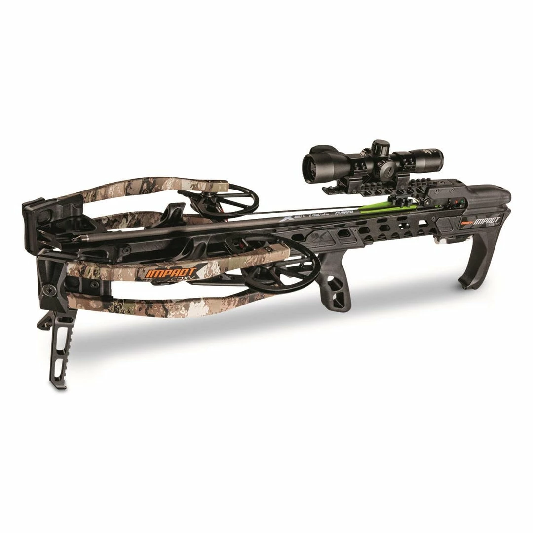 Find your target and leave your mark with the all-new Impact from BearX. This crossbow features an incredibly narrow frame at just 8-1/8” wide when cocked and 12-1/16” uncocked. The Impact fires arrows at blazing speeds at 420 feet per second with a draw weight of 180 lbs. The all-new detachable silent cocking crank can be used to de-cock the crossbow and features an anti-reverse mechanism to stop the crank when the handle is let go. In addition to the detachable cocking includes a Speed Comp Scope, 4-arrow quiver, sling, and rail lube / string wax. The Impact is available in TrueTimber Strata and Veil Stoke camo.