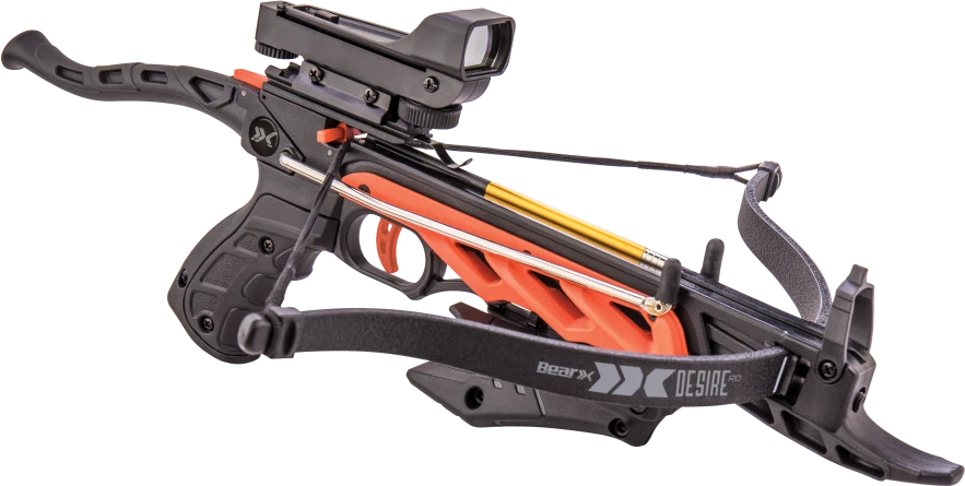 - Compact design pistol crossbow is user-friendly with self-cocking arm, forearm grip