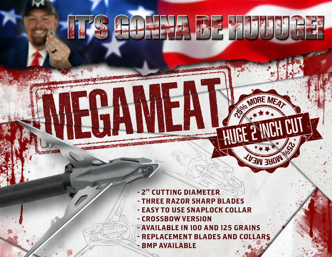 It’s Gonna Be Huuuge! The All New MegaMeat is a 3 blade, 2 inch cut, expandable broadhead. If you really want to bring home the meat… Try the new MegaMeat.