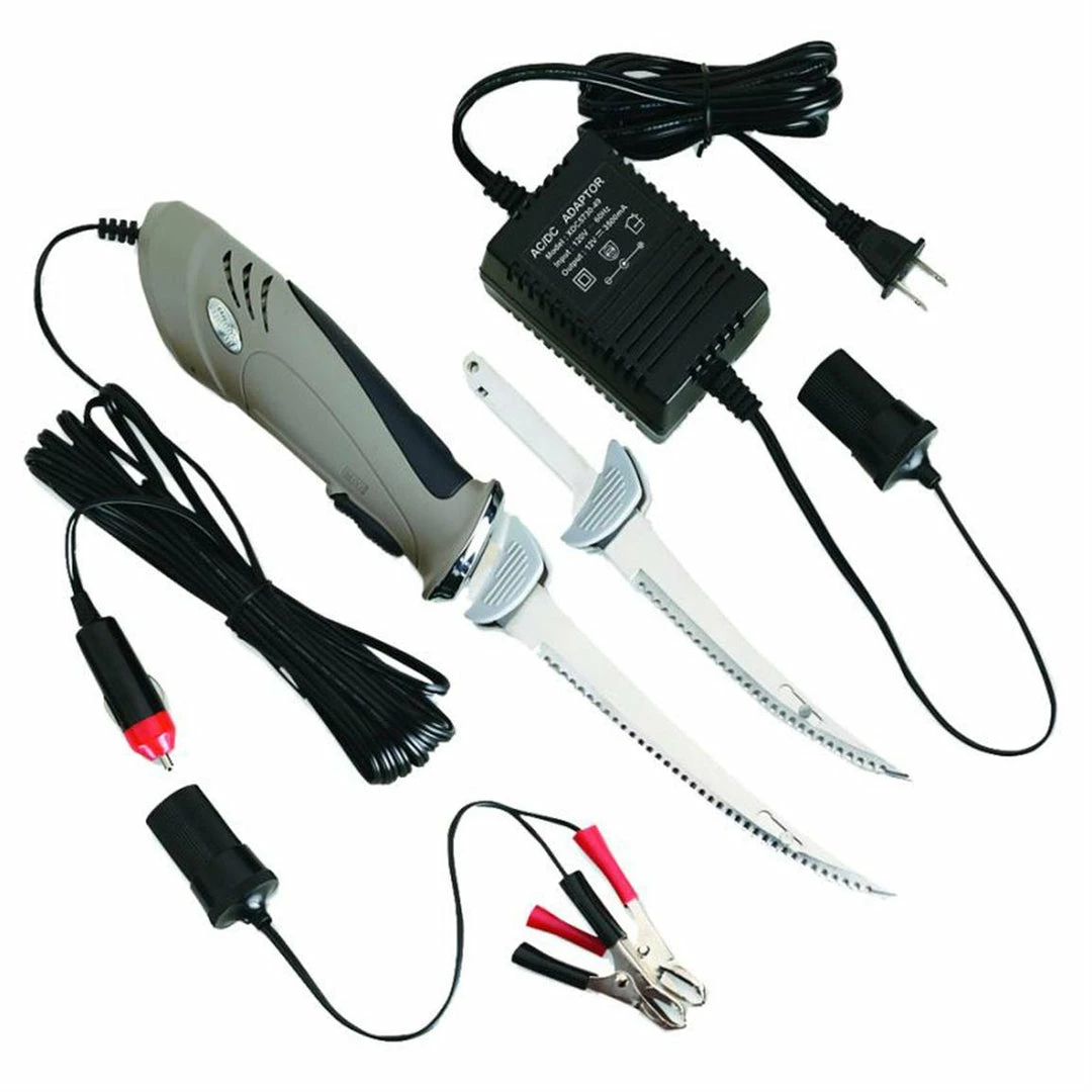 Makes quick work out of your catch of the day! Quiet, long-lasting motor. Advanced air flow design. Relaxed grip body. Compact travel case lets you keep the Set close at hand. Set also includes plastic cutting board and 2 blade lengths. Comes with 12V DC lighter plug and long 110V AC power cord.