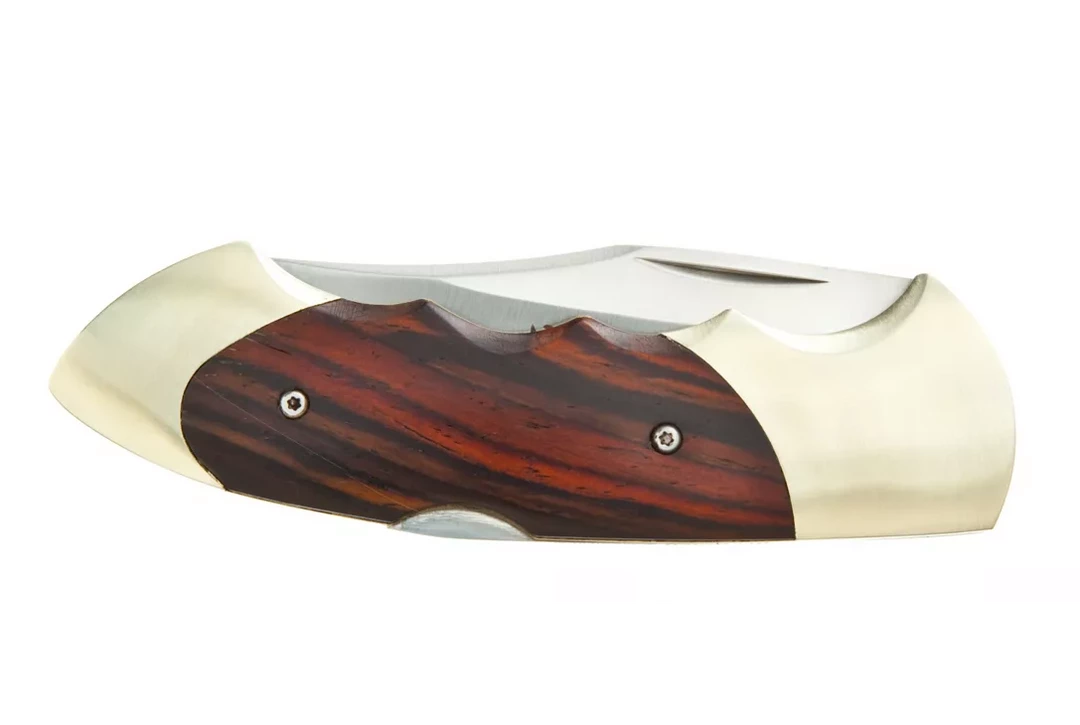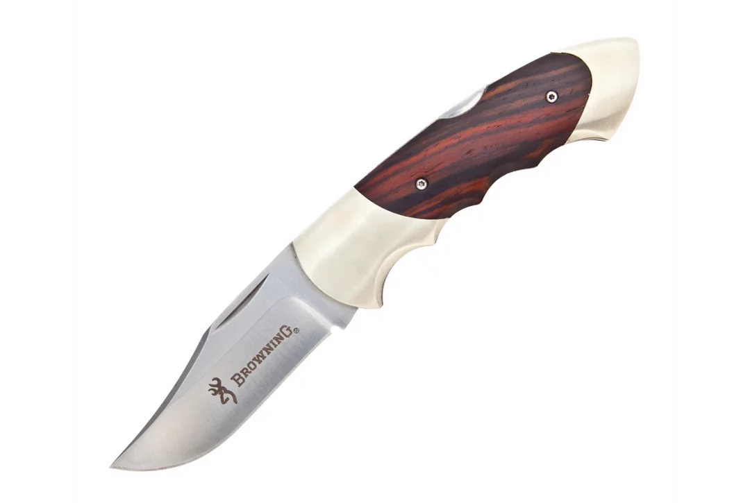 Designed by Russ Komer, the updated folding, finger groove design sports a canoe handle and substantial bolsters for strength. Browning® 111 Cocobolo Handle Folding Lockback Knife blades are Sandvik® 12C27 stainless steel – an exceptionally pure steel that takes an edge well and holds it. Includes nylon sheath. Blade length: 3-1/4”. Imported.