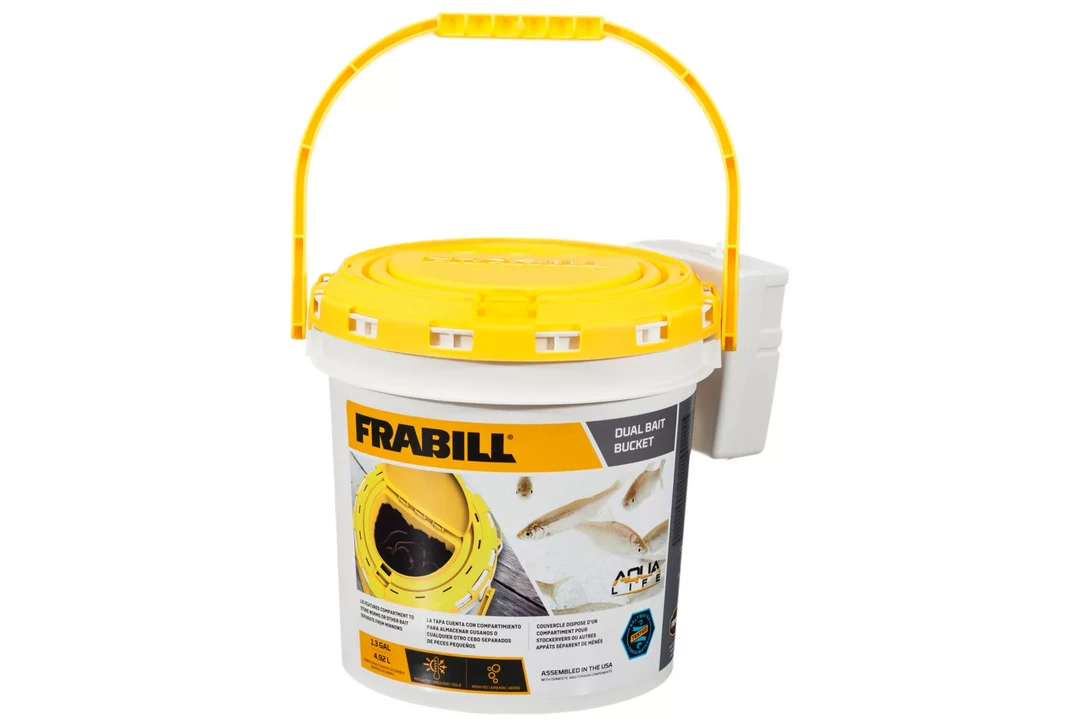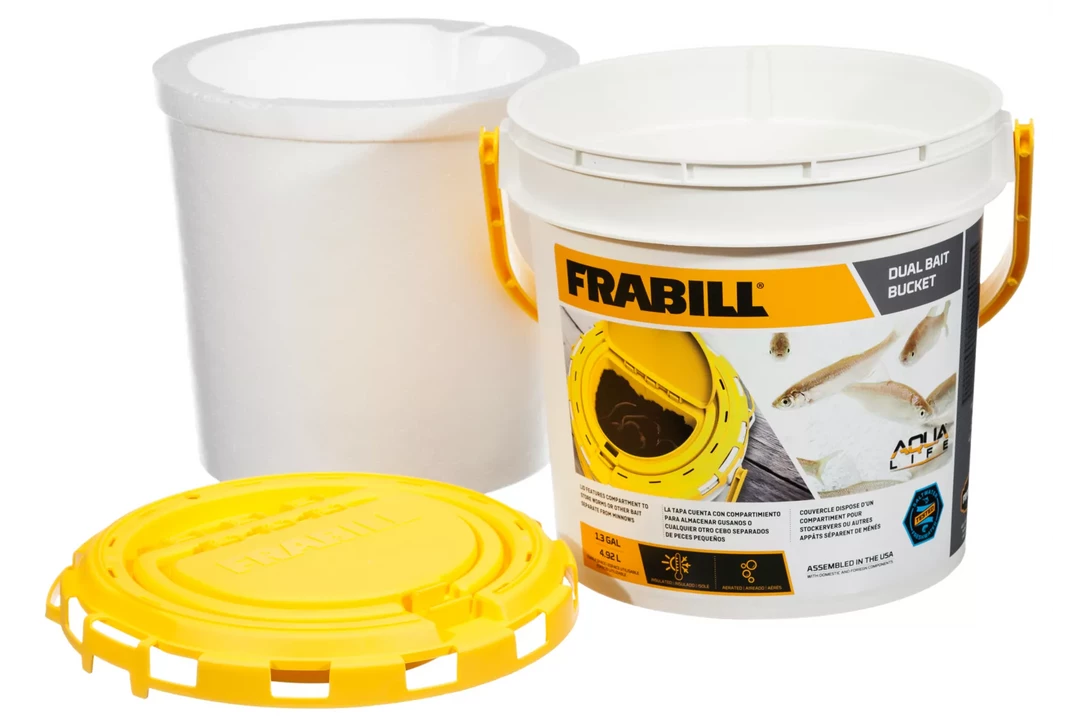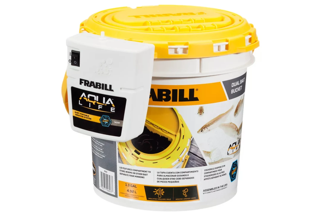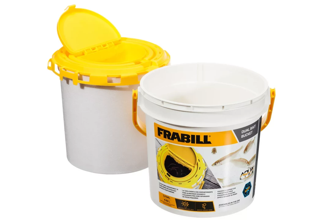 The complete system for the mobile live bait angler. The Frabill® Insulated Dual Bait Bucket with Aerator is engineered to help keep both minnows and other bait alive and healthy during your fishing trip and beyond. Its 1.3-gallon interior features a removable closed-cell foam liner to help keep the water temperature within your bait’s preferred range. Rather than limiting your options, the Frabill Insulated Dual Bait Bucket also has a unique lid system with a built-in separate storage compartment to accommodate worms or other bait. The system includes a clip-on, battery-operated Frabill Aqua-Life® Portable Aerator with high-output air stone, capable of aerating as much as 10 gallons of water, to ensure your minnows stay frisky. Runs on 2 D-cell batteries (not included). Sturdy carry handle.