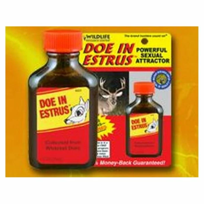 Natural Doe Urine with Estrus Secretions. Carefully collected from whitetail does. Triggers the sexual attraction instinct of Whitetail Bucks. Brings in aroused bucks.